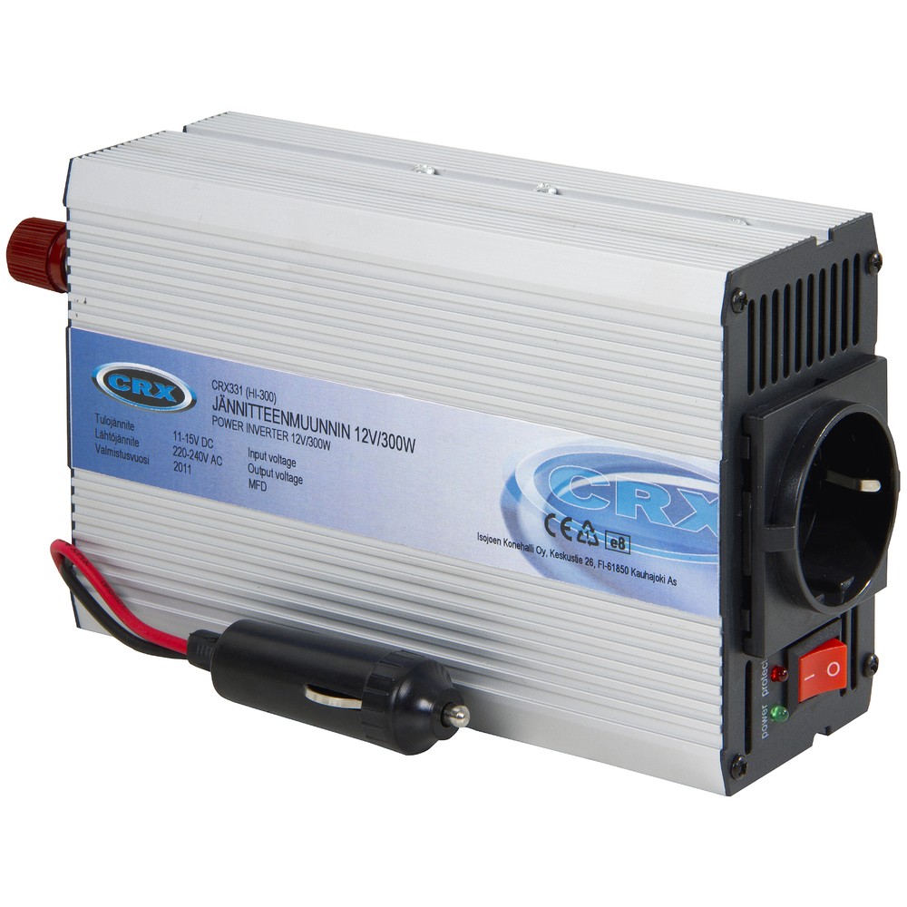 - muuntaa 12 V tasajännitteen 230 V vaihtojännitteeksi (muunnettu siniaalto)
