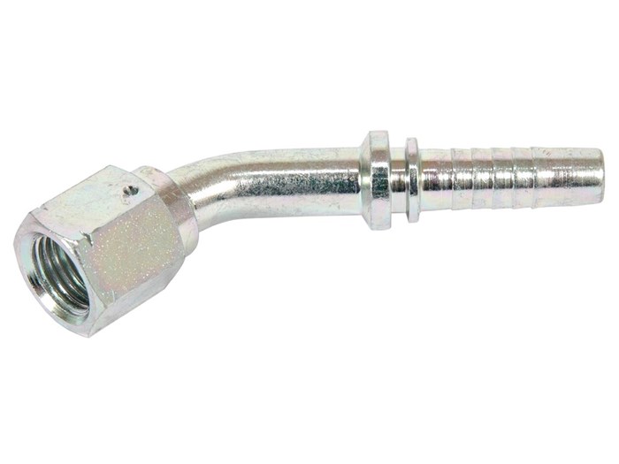 JIC-liitin lukkolangalla. Liitäntä: Sisäkierre JIC 37° kartio. Tiivistys: Metalli vastaan metalli.