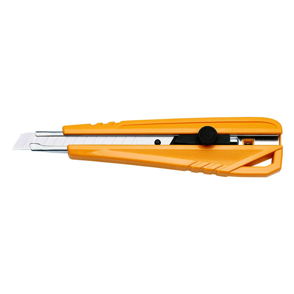 KOMELON Katkoteräveitsi 9mm. Veitsessa tukeva ruuvilukitus. Terä valmistettu korkealaatuisesta SK2Cr4 teräksestä. Erittäin luja ruostumattomasta teräksestä valmistettu teräohjain.