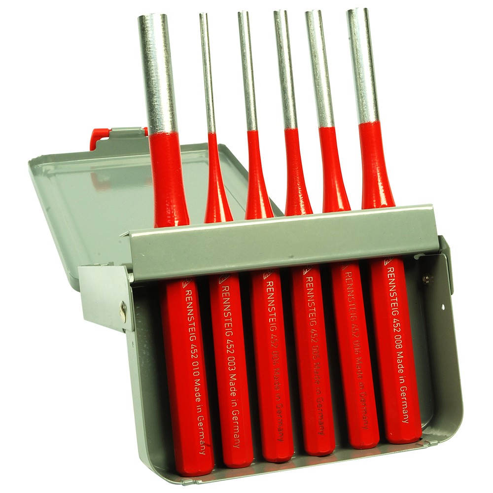 kromivanadiumterästä, karkaistu kärki - sisältää 6 kpl tuurnia, koot Ø 3, 4, 5, 6, 8 ja 10 mm - tuurnan pituus 150 mm - kromipäällystetty - punainen pulverimaalaus - kovuus 59 HRC - 80 %... Lue lisää