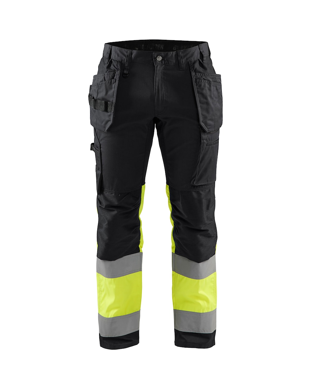 kolmiosaiset riipputaskut, mittatasku, jossa puukonpidike ja kynätasku. Sertifioitu EN ISO 20471 luokka 1.