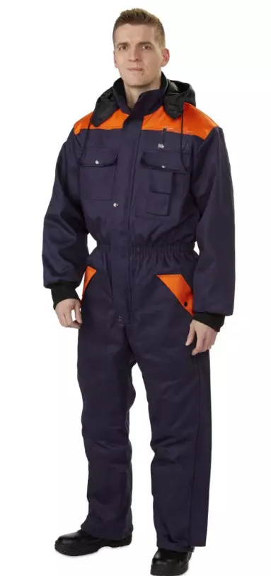 Väri tummansininen/oranssi, materiaali palosuojattu puuvilla, neliöpaino 320 .