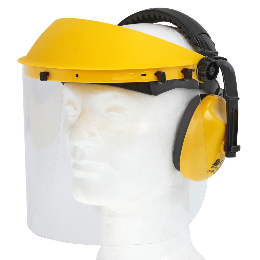 - sisältää polykarbonaattivisiirin, pääpannan ja kuulosuojaimet