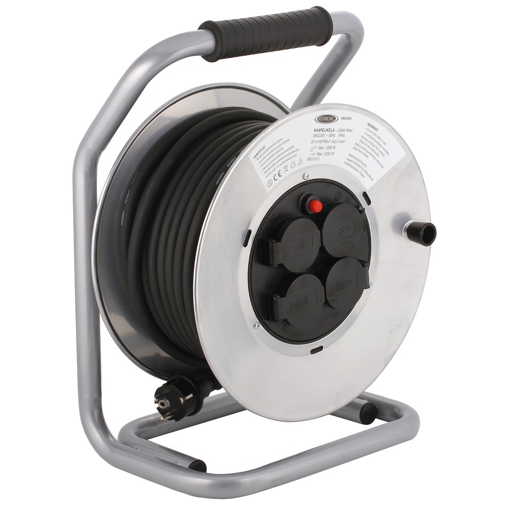kumi-/neopreenikaapeli 25 m (H07RN-F 3x2,5 mm²) - max. kuormitus kelalla 1200 W, kelalta purettuna 3200 W - varustettu ylikuumenemissuojalla - neljä maadoitettua, roiskevesisuojattua pistorasiaa... Lue lisää