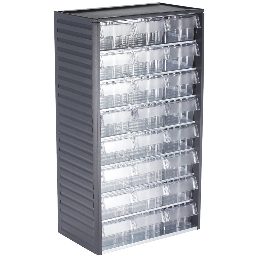 polypropeeni runko, hyllytasot sinkittyä teräslevyä - läpinäkyvät laatikot polystyreenia - soveltuu kiinnitettäväksi seinään, pyörivään telineeseen tai työpöydälle - 24 keskikokoista... Lue lisää