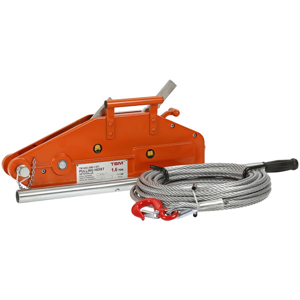 max. kapasiteetti 1,6 tn - suurin kuorma vedossa 2,4 tn - vaijeri Ø 11 mm x 20 m - sisältää vaijerin salpakoukuilla - varmuuskerroin 5:1 - paino (ilman vaijeria) 11,7 kg